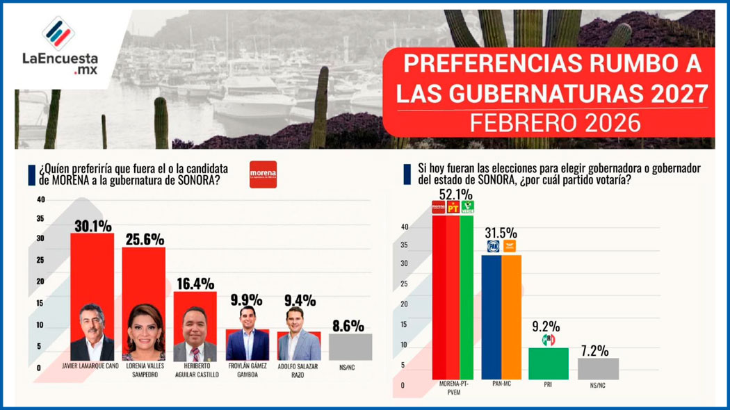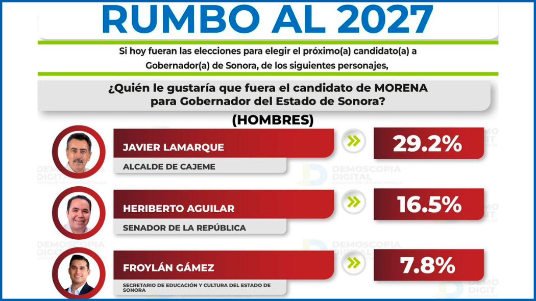 Según La Encuesta MX, Javier Lamarque destaca en un careo con morenistas que incluye a hombres y mujeres, el Alcalde de Cajeme tiene 30.1 por ciento de apoyo, Lorenia Valles 25.6 por ciento, Heriberto Aguilar 16.4 por ciento, Froylán Gámez 9.9 y Adolfo Aguilar 9.4, el segmento de “no sabe o no contestó” es de 8.6 por ciento.